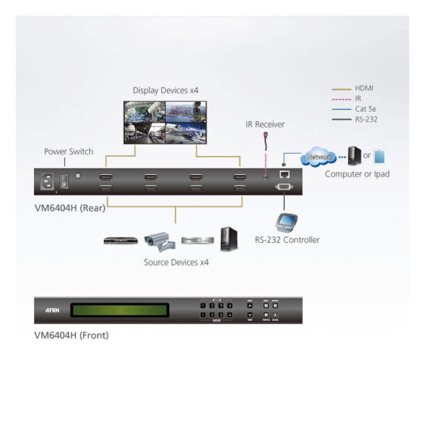 Матричният HDMI 4K суич VM6404H поддържа два от последните стандарти за 4K видео резилюции: 3840 x 2160 and 4096 x 2160. Устройството осигурява мощна HD видео обработка, за да достави 4K видео към 4 дисплея с кристално чисто качество. VM6404H поддържа 4K@60Hz, HDMI 2.0* и HDCP 2.2 и предлага лесно превключване, което използва FPGA матрична архитектура, гарантираща стабилни видеопотоци, контрол в реално време и надеждно предаване на сигнала. Вграденият високопроизводителен Scaler се използва за конвертиране на различните входни резолюции в подходящи за изходните дисплеи резолюции, така че да се поддържа най-високото качество на всички екрани. Превключвателят разполага с функция за конфигуриране на видеостена от дисплеите – конфигурирането се извършва през уеб интерфейс и позволява създаването на предварителни, до 8 на брой профила на свързване на източниците, съответстващи на различни подредби на дисплеите във видеостената. VM6404H е идеално решение за приложения, които изискват множество HDMI източници и дисплеи да работят и заедно, с интуитивно конфигуриране на комбинациите. Може да се ползва за публични прожекции, цифрови класни стаи, конферентни зали и навсякъде, където се изисква обработка на 4K видео в реално време * HDMI 2.0 поддържа 3840 x 2160 @30 Hz (4:4:4), 3840 x 2160 @60 Hz (4:2:0), 4096 x 2160 @ 30Hz (4:4:4), 4096 x 2160 @ 60 Hz (4:2:0)