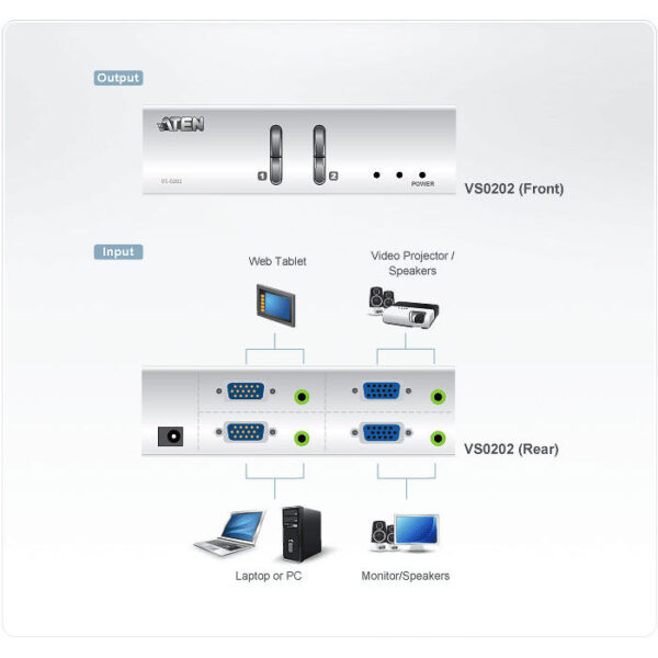ATEN VS0202 :: 2-портов Video Matrix превключвател, VGA, 2 входа, 2 изхода, 300 MHz, 1920×1440@60Hz, до 65 m