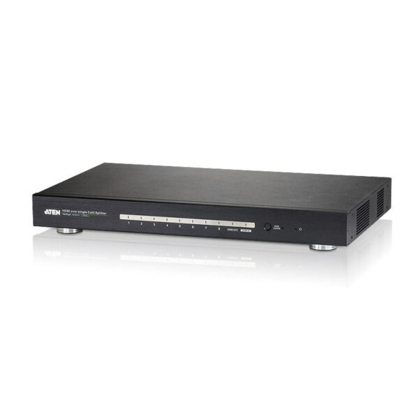 VS1818T е 8-портов видео сплитер за HDMI сигнал, който ползва Cat. 5/6 мрежов кабел за преносна среда и разделя единичен сигнал към 8 монитора.