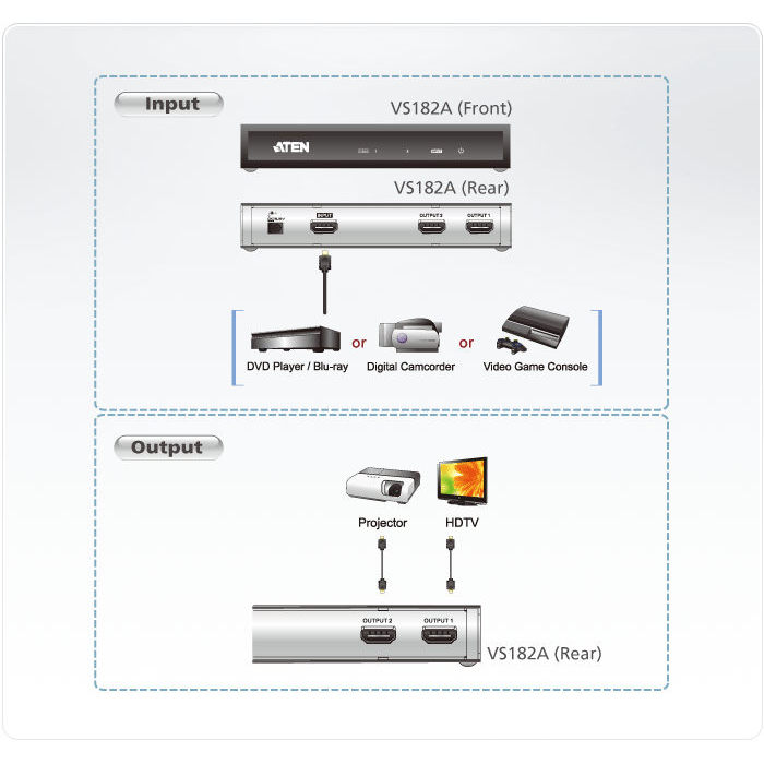 Подава HD видео сигнал от един източник към 2 дисплея едновременно. Поддържа всички HDMI устройства – DVD плейъри, сателитни приемници и всички дисплеи с HDMI порт.
