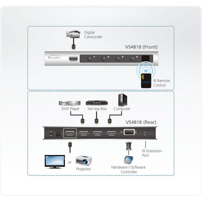 Позволява един HDMI дисплей да показва видео сигнал от 4 HDMI източника – DVD плейъри, конзоли, сателитни приемници, камери и др.