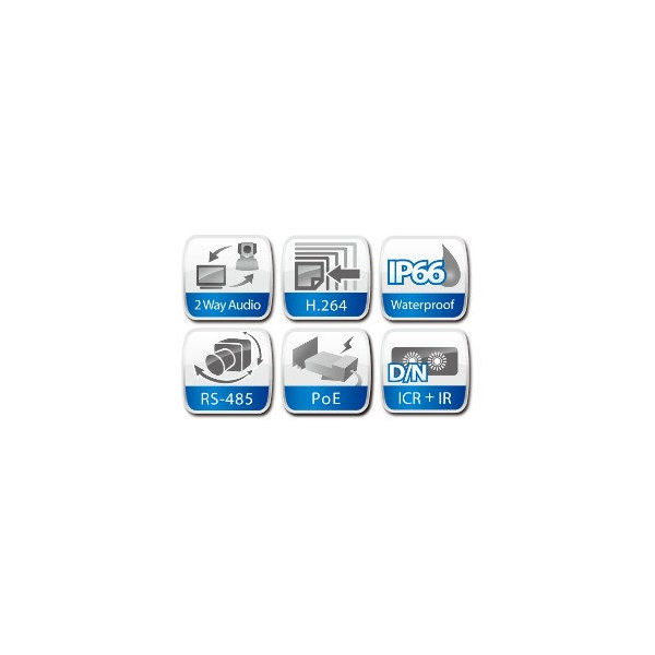 Охранителна IP камера с PoE захранване, подходяща за вътрешен и външен монтаж (IP66), H.264 кодек, подходяща за нощно наблюдение, вграден IR прожектор. Поддържа двупосочно аудио, включен безплатен софтуер за 32-канално IP базирано наблюдение, 2GB вградена памет за локален запис
