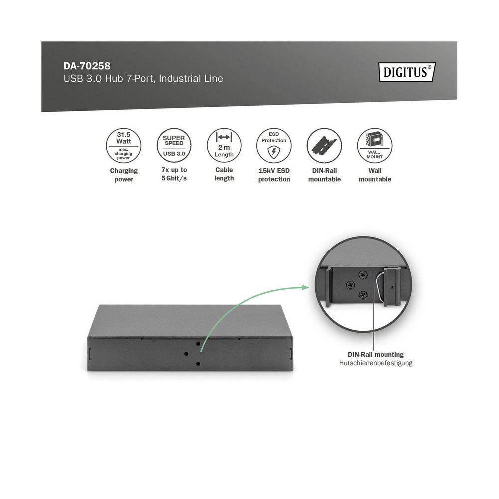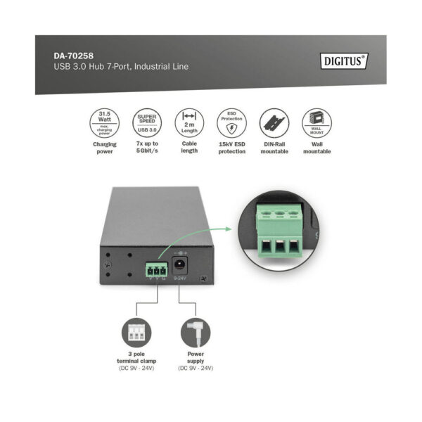 USB 3.0 ХЪБ, 7 порта, индустриален, метален 15-kV ESD, маса, стена, монтаж на DIN шина