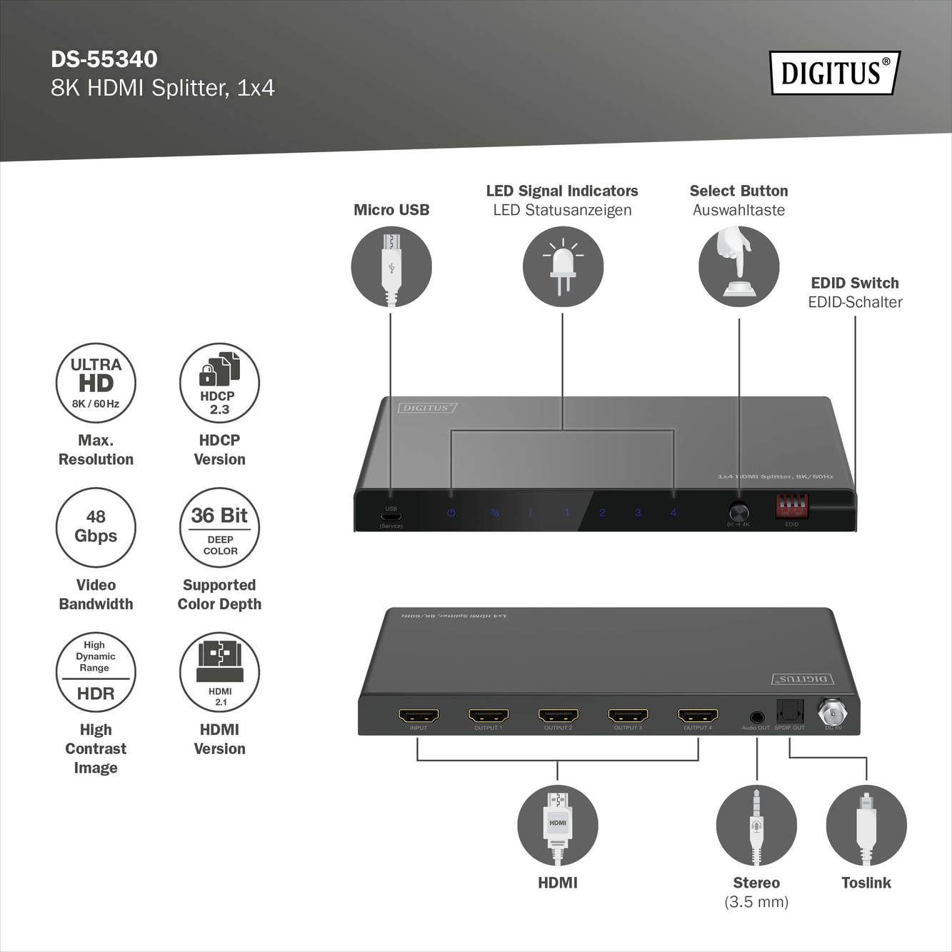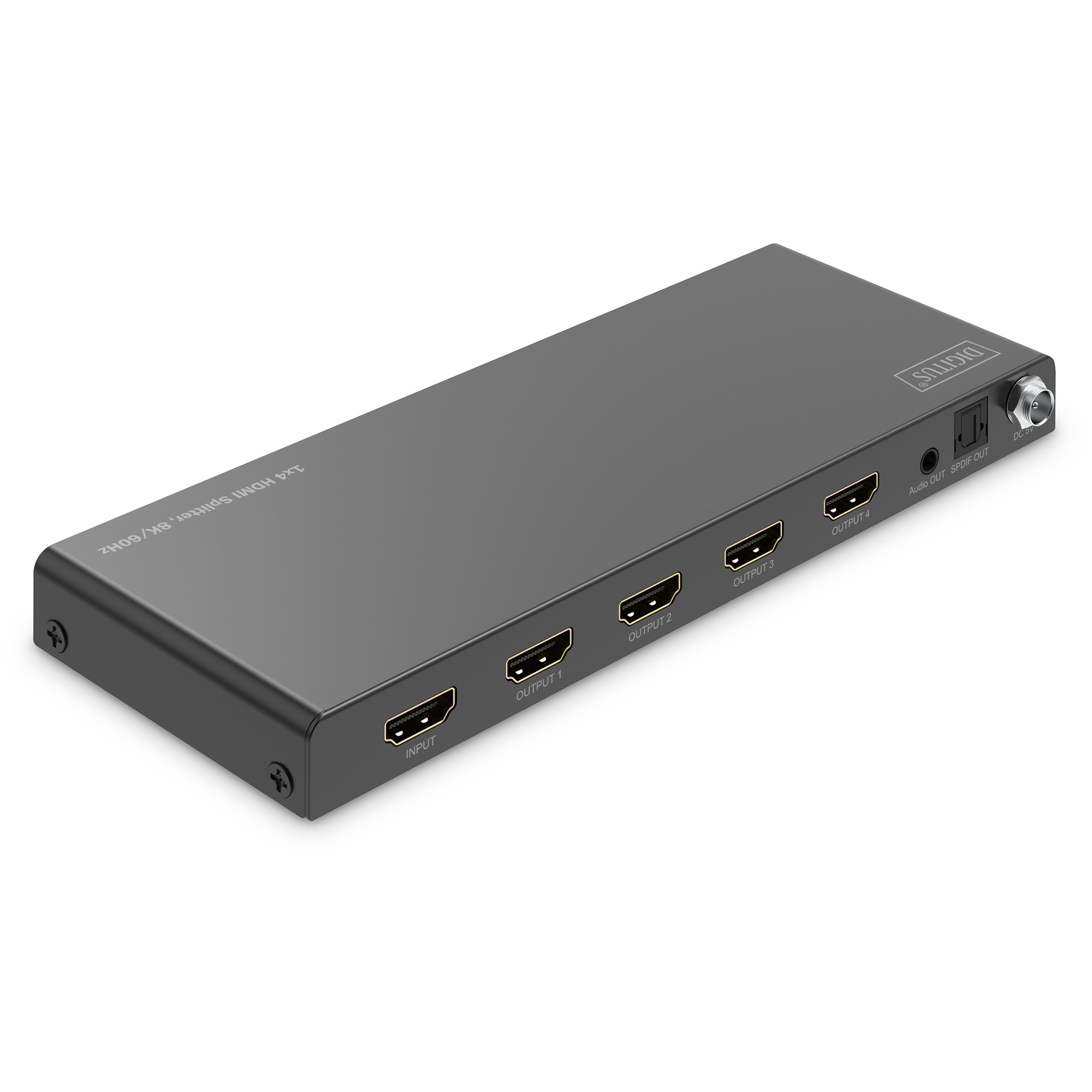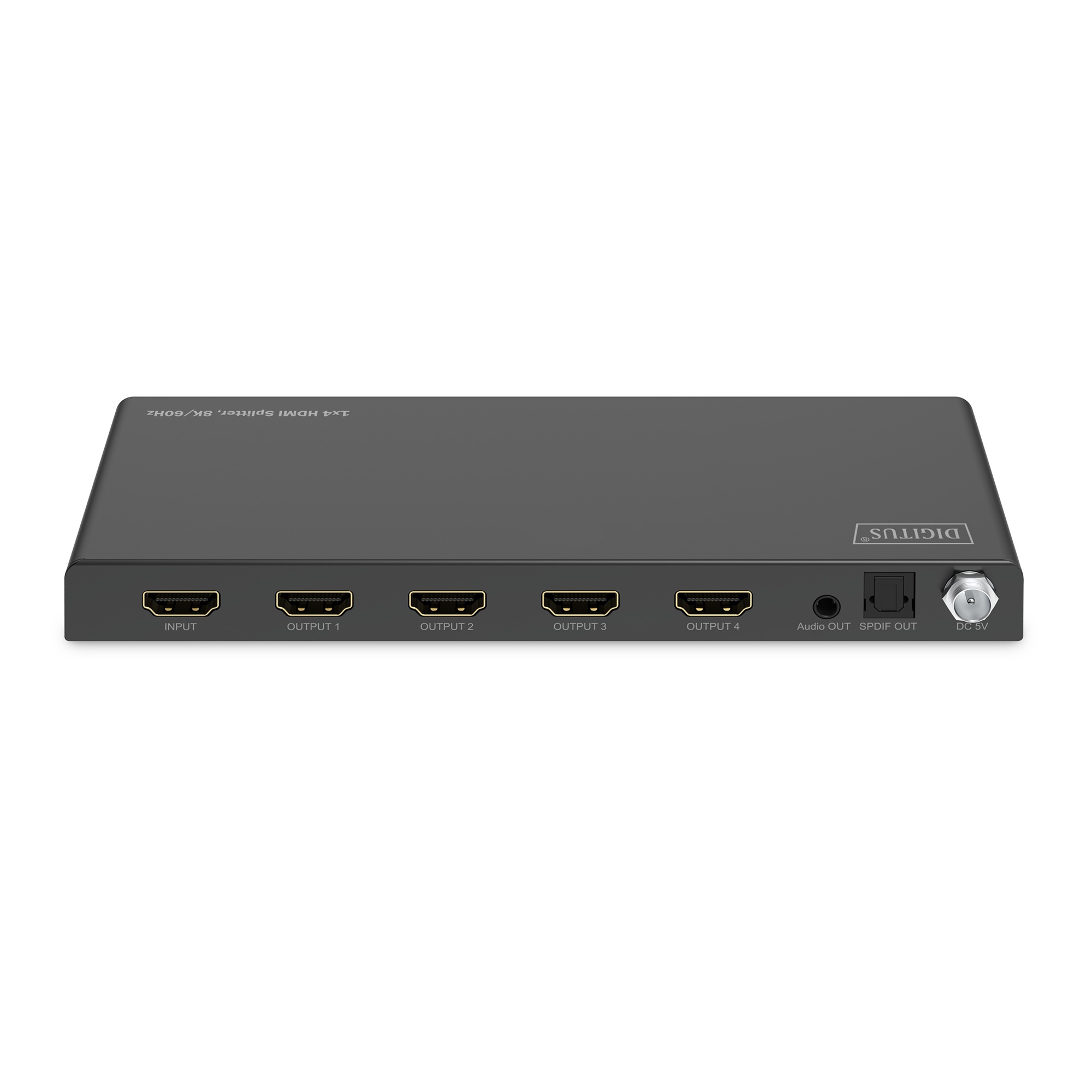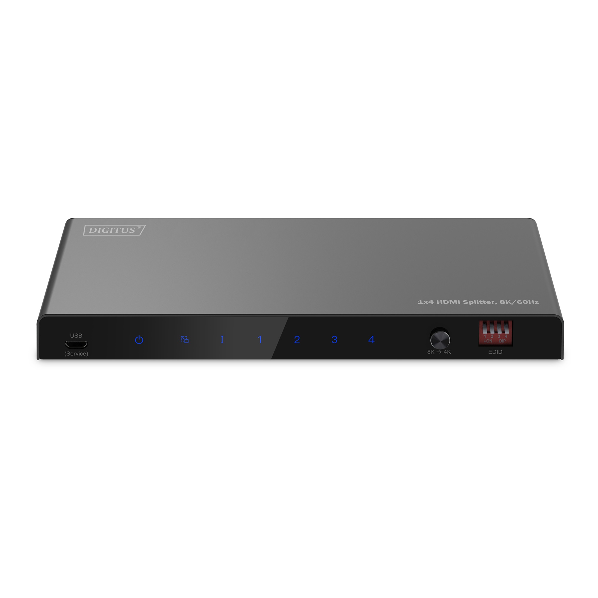 HDMI сплитерът от DIGITUS разпределя аудио и видео сигнали от вашето HDMI устройство към 4 телевизора, екрана или проектора с максимална резолюция 8K/60Hz.