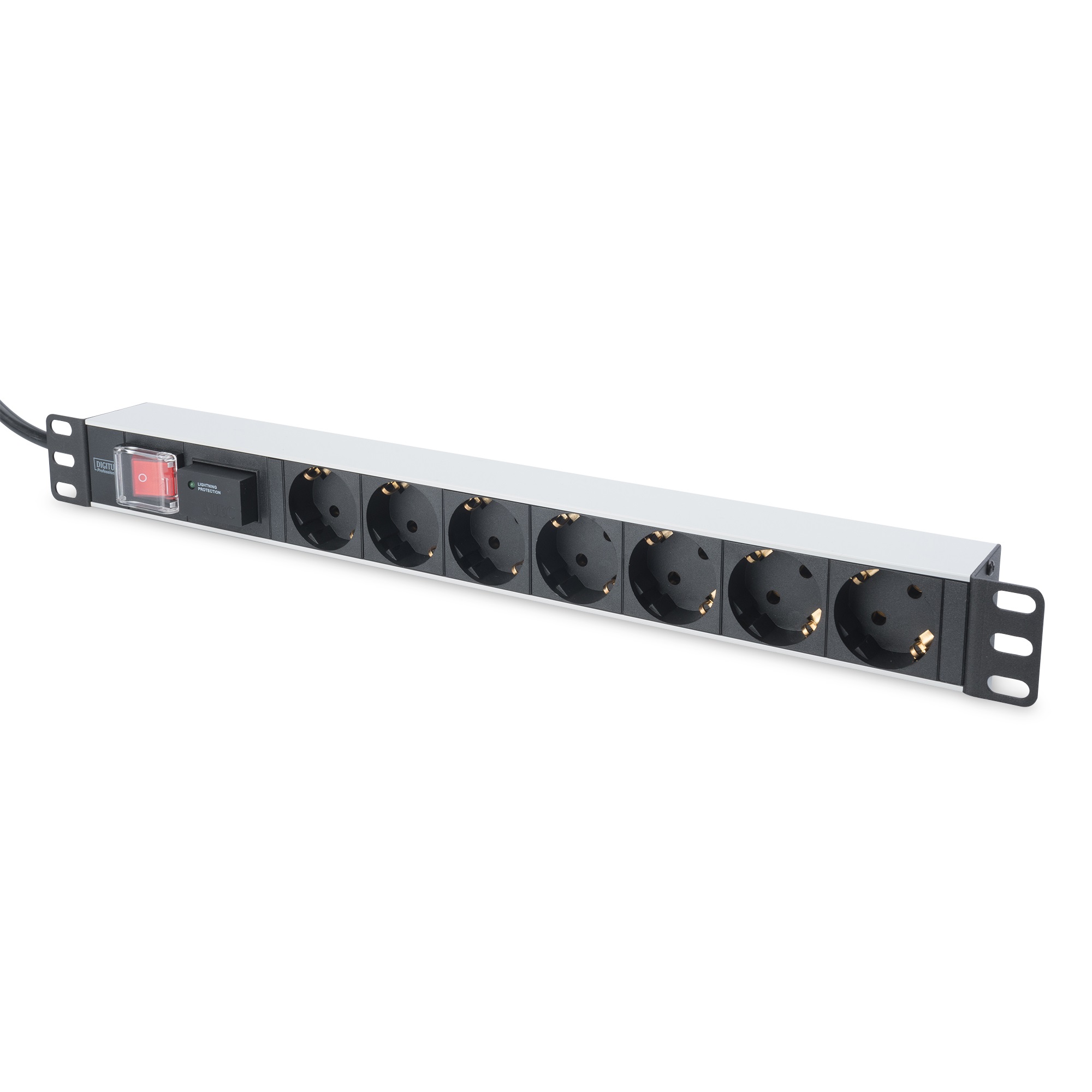 DIGITUS DN-95407 :: Разклонител лента с ключ, 7- гнезда Shuко, захранване със защита от пренапрежение 45°, 16A, 2.0 м