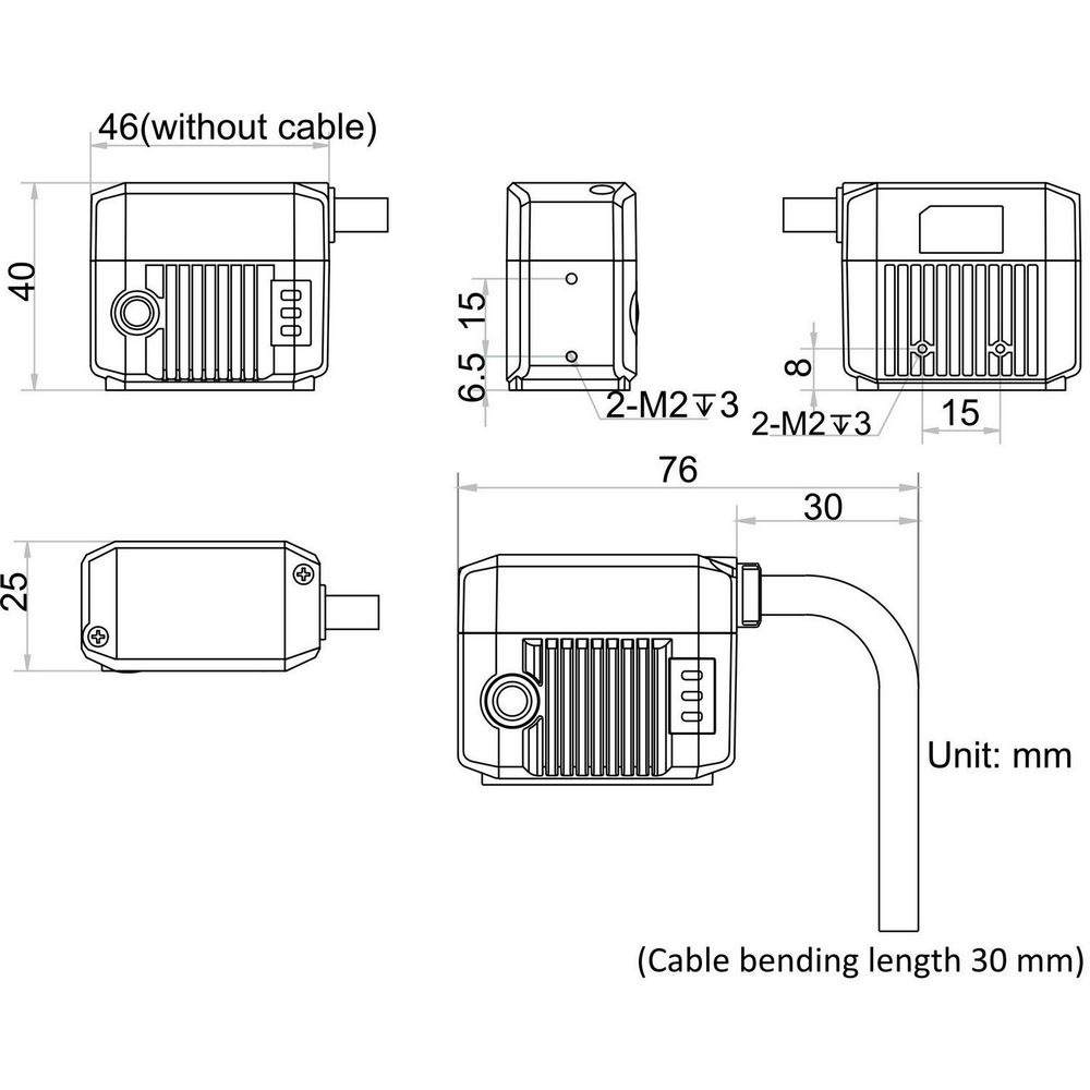 | Digital I/O | 17-pin M12 connector provides power and I/O, including non-isolated input (Line 2) × 1, non-isolated output (Line 3) × 1, configurable bi-directional non-isolated I/O × 2 (Line 0/1), and RS-232 × 1. Supports device triggering via pressing button on side. |