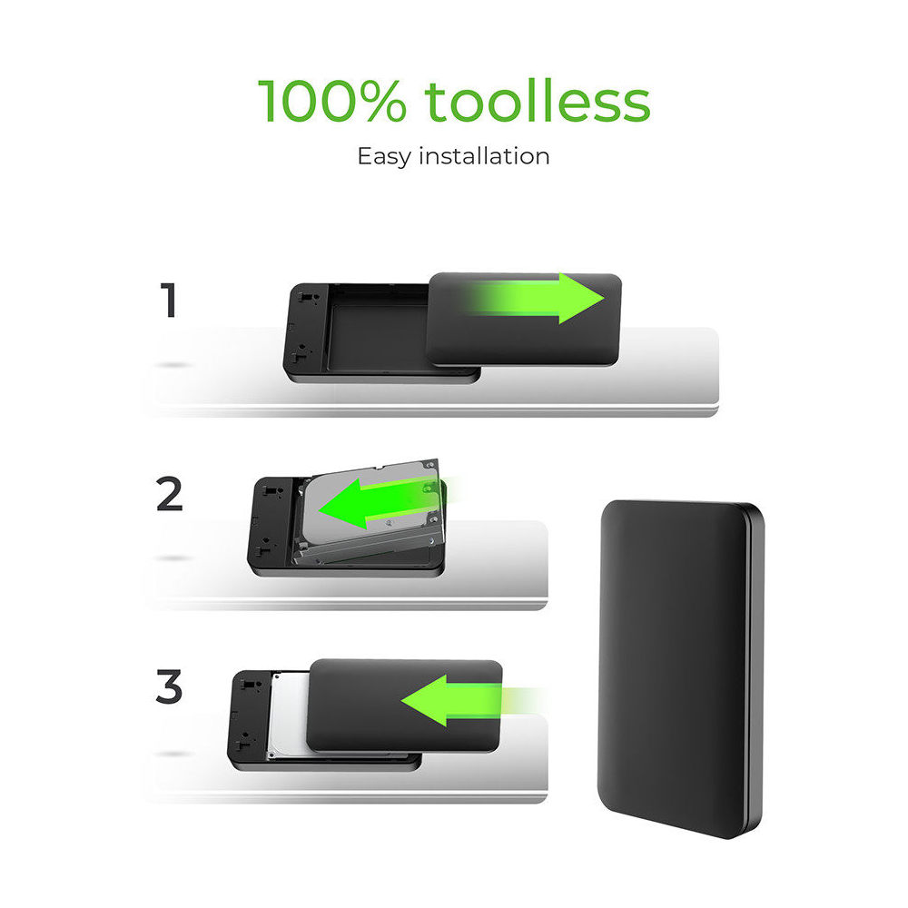 USB 3.2 Gen 2 кутия за 2,5″ SATA SSD и HDD с височина до 9,5 mm може да се инсталира тук безопасно и напълно без инструменти. Допълнителният силиконов капак предпазва от повреда в случай на падане. Следователно инсталираното хранилище е идеално защитен и може да пътува безопасно в багажа ви. Връзката USB Type C осигурява скорост на трансфер до 10 Gbit/s и по този начин супер бърз обмен на данни. В същото време кутията е обратно съвместима с USB 3.0 и USB 2.0.