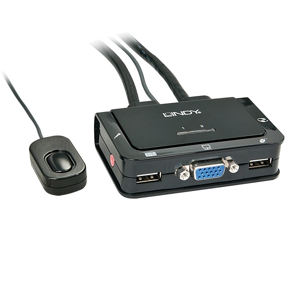 Позволява два компютъра с VGA видео да се управляват от един комплект клавиатура, мишка и монитор. Поддържа превключване и на звука. С интегрирани кабели за лесна и бърза инсталация.