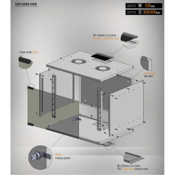 - Предлагат се в ширина от 535 мм и дълбочни от 400 мм (7/9/12U) и 300 мм (7U)