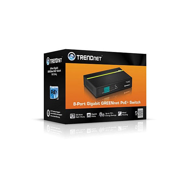 8-портов гигабитов суич с PoE+ функционалност – осигурява свързаност и PoE захранване на съвместими мрежови устройства – Access Points, IP/PTZ охранителни камери, VoIP телефони и др.