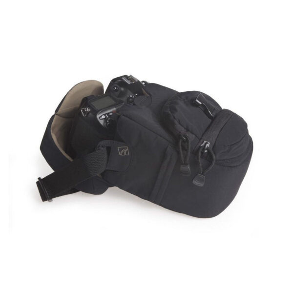 Практична чанта с отвор от горната страна, подходяща за пренасяне на камера с прикрепен обектив. Специално вътрешно отделение, компактно и уплътнено за максимален комфорт. Може лесно да се превърне от чанта в кобур с помощта на лентата за прикрепване към колан. Външен джоб с цип от предната страна с отделения за карти, батерии, кабели.