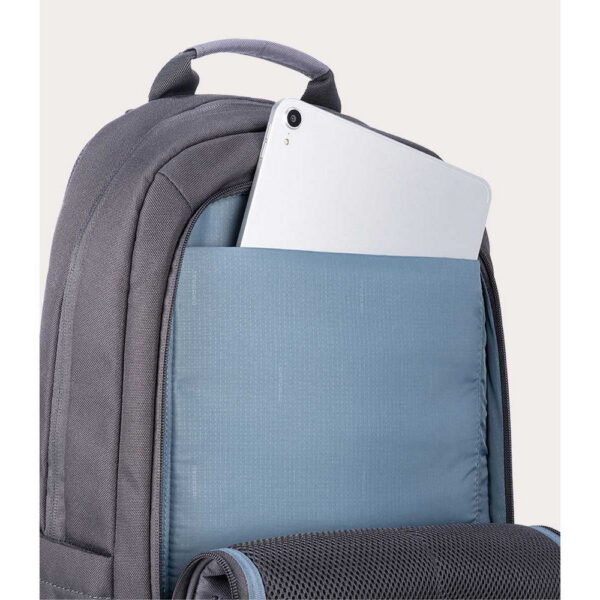 Двуцветна раница за лаптоп 15.6″ и MacBook Pro 16″ от 100% рециклирана материя от PET бутилки. Голямото вътрешно отделение е оборудвано с подплатен джоб за лаптопи и таблети. Отстрани има два еластични джоба за бутилки, чадъри и подобни по размер вещи. Задната страна, с ергономична облегалка и регулируеми, подплатени презрамки, е оборудвана с колан за куфар. Предпазен джоб на гърба.