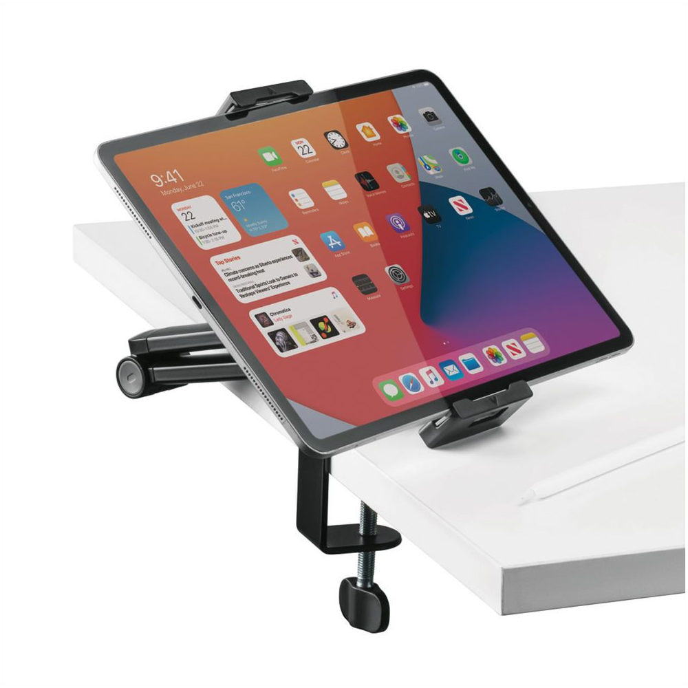 Универсалната стойка за таблет е идеална за ежедневна работа и забавление. C-скобата държи устройството здраво, а множеството защитни подложки поддържат устройството сигурно и предотвратяват надраскване. Монтажната глава на 360° може да се върти свободно за всеки желан ъгъл на гледане.
